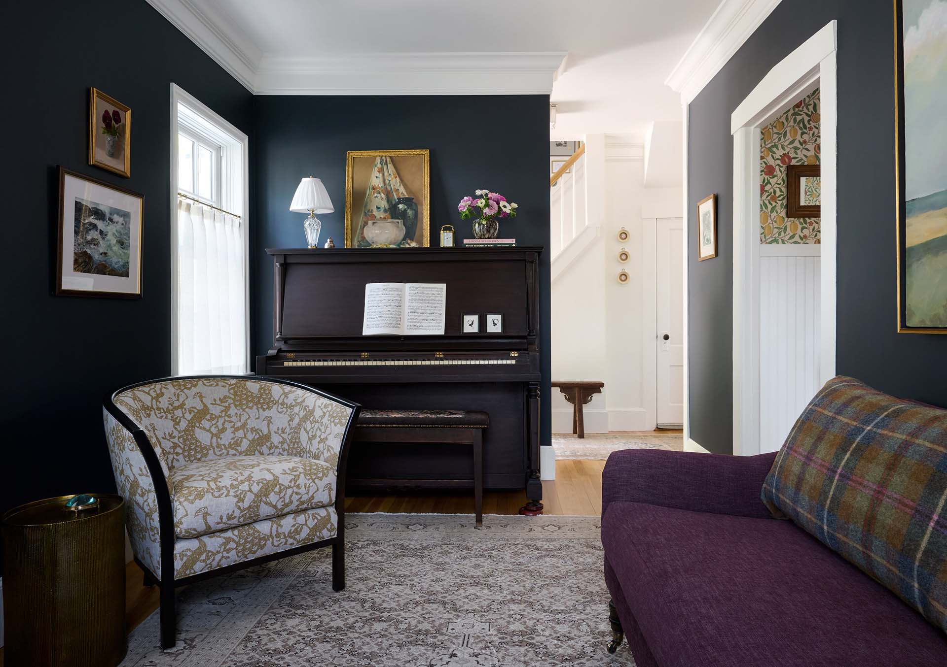 One of the surprises of the renovation? In addition to knocking down walls, they added them. “The biggest move we made was taking down the wall by the stairs and creating a banister there, so that when you first walked in, you had a visual of the staircase,” says Daskalakis. Next, they added a partial wall to define the living room, creating the perfect spot for Chambers’s grandmother’s upright piano. And just like that, the home had a real front hall and separate living room. .