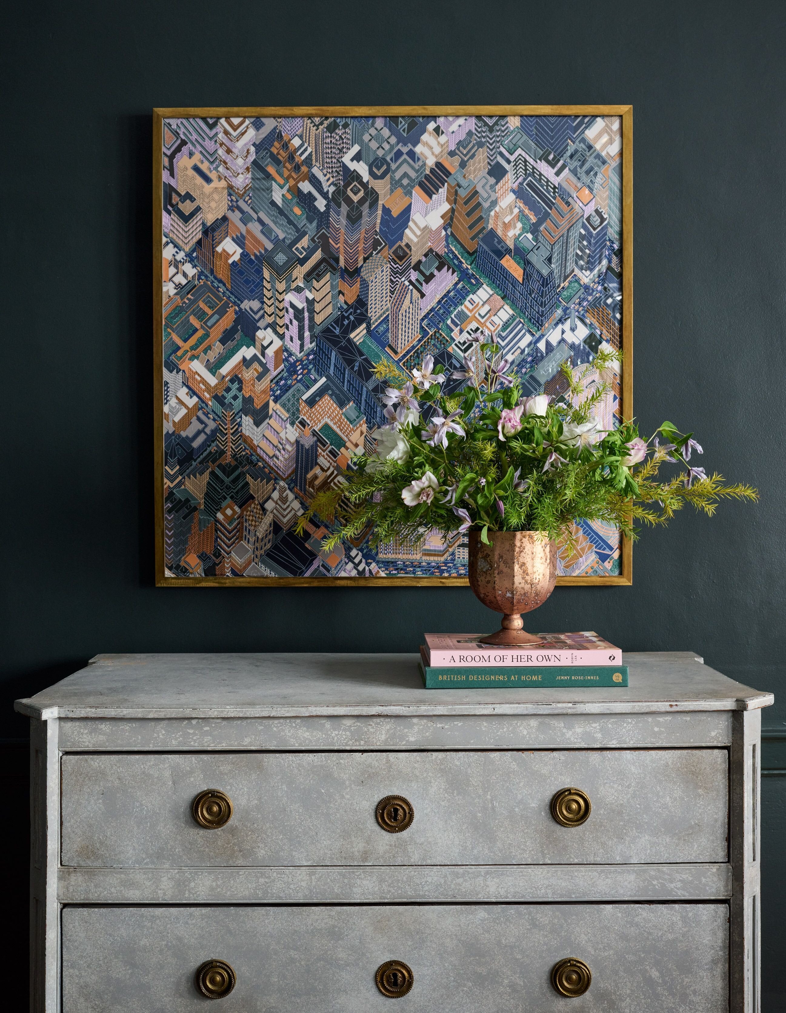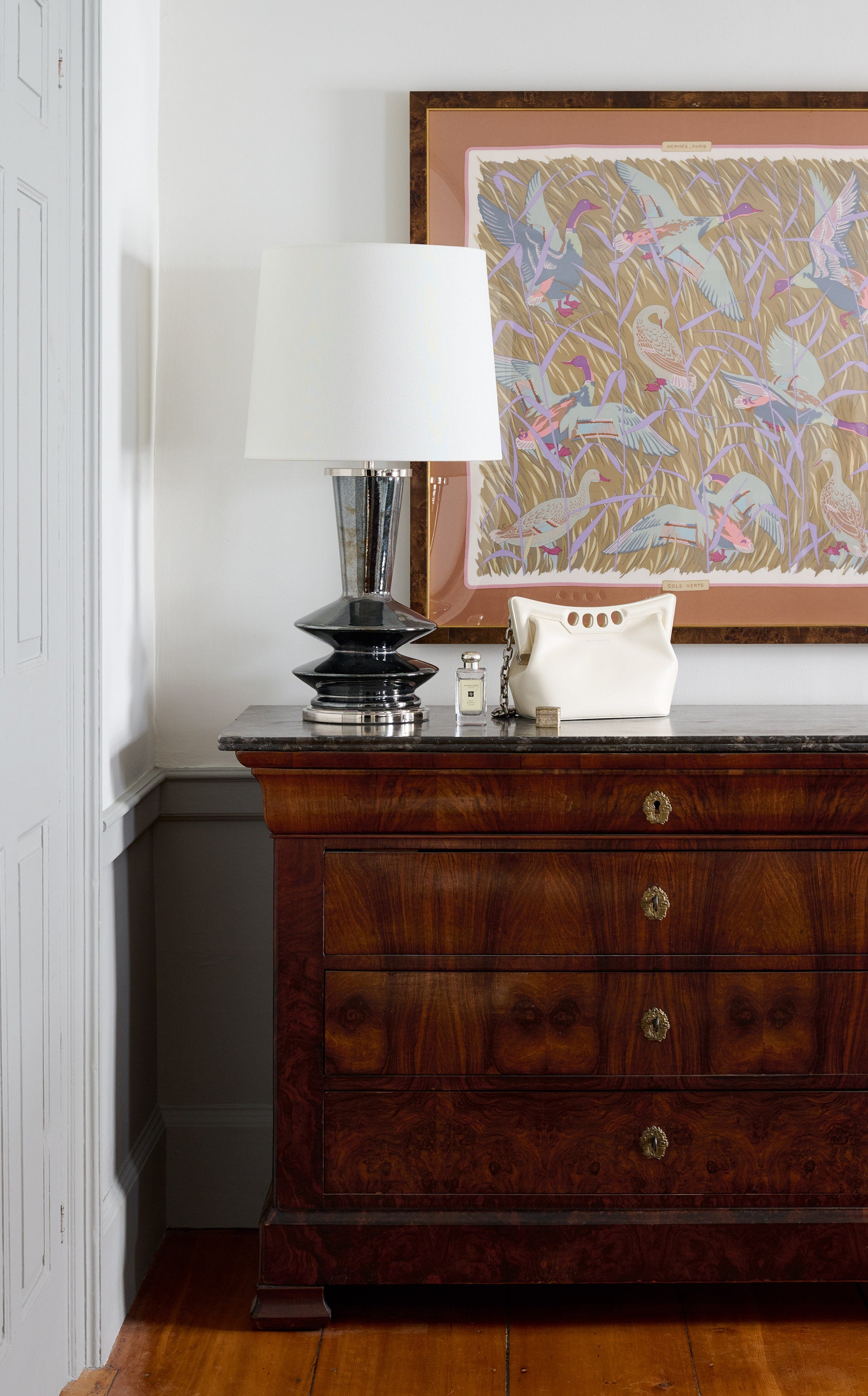 Taking a cue from her love of fashion and design, Dasklakis frames five of the classic French écharpes and places them alongside works by painter Donald Jurney, 80’s Chanel brooches, and period furniture and fixtures from The Archive collection of New England-sourced antiques. The vibe is the perfect pairing of vintage and modern, a sought-after look that can only be created when every piece is deliberate and has a story.